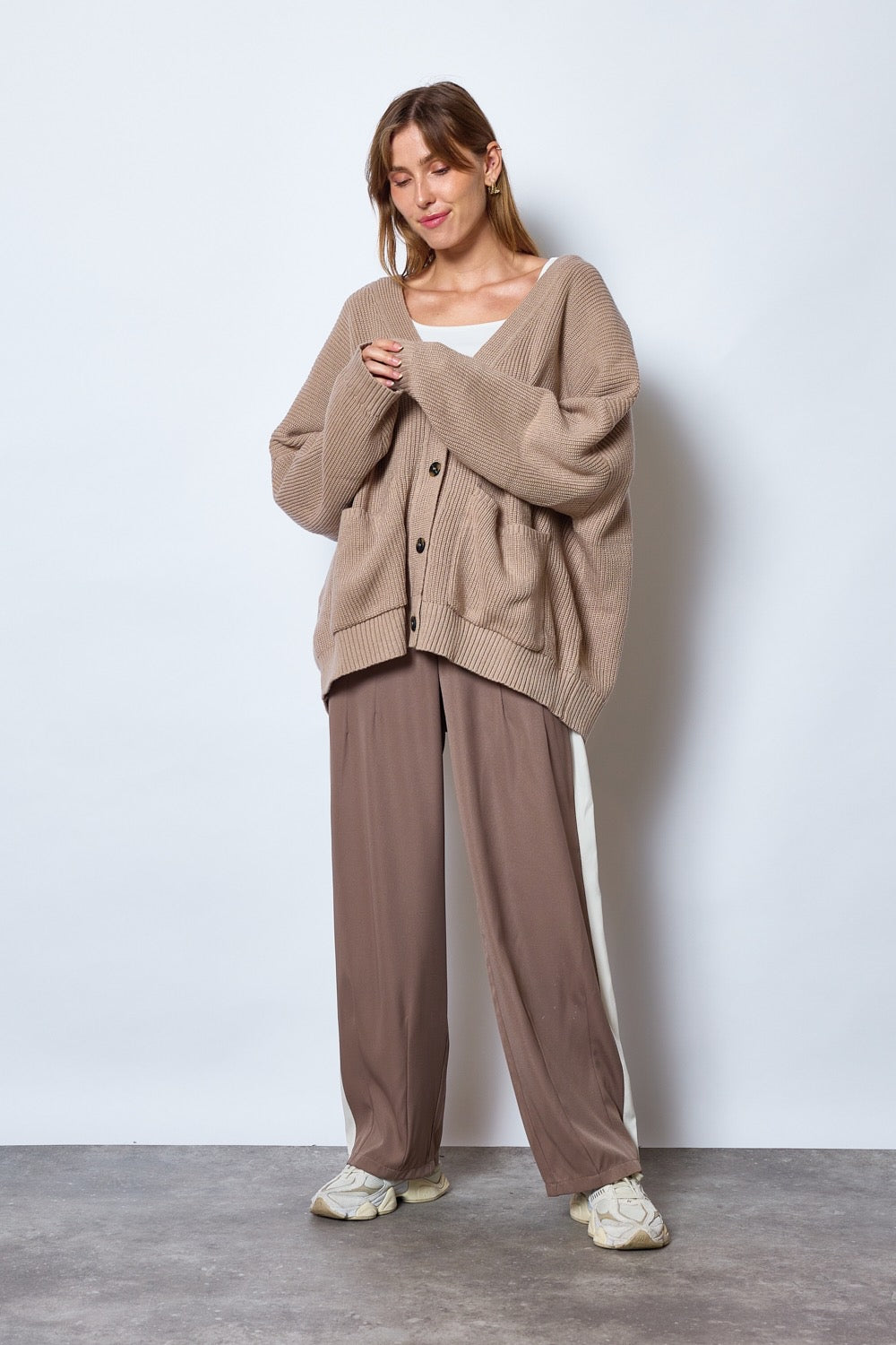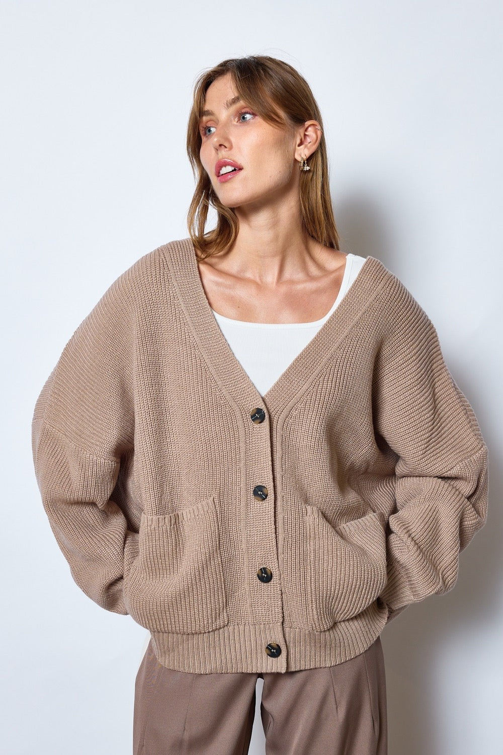 Gilet ample avec col en V et manches longues. Tricot côtelé avec large bordure au bas et aux poignets. Fermeture par boutons contrastés sur le devant. Deux poches plaquées au niveau de la taille.